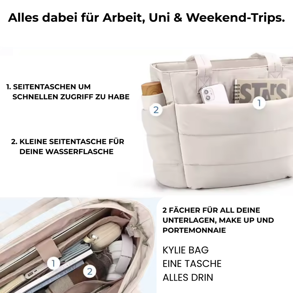 „Ich benutze die Kylie Bag täglich auf dem Weg zur Arbeit. Sie hat genau die richtige Größe, und ich bekomme Laptop, Notizbuch und Wasserflasche locker unter.